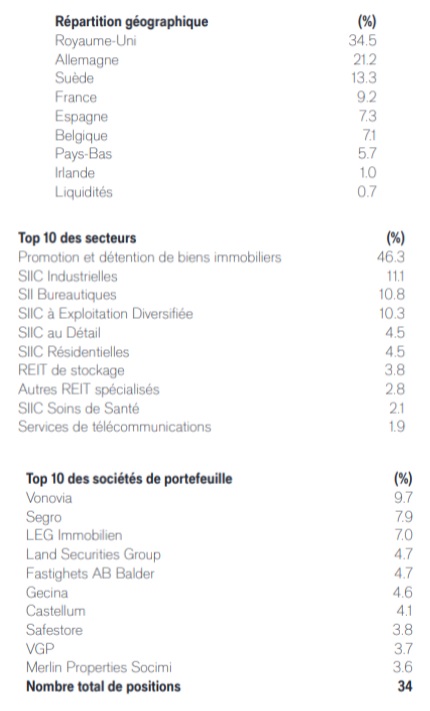 Le Compartiment investit au moins 75 % de son actif net dans des actions ou des instruments assimilables à des actions de sociétés immobilières ou dont le siège social est sis dans l’Espace Economique Européen ou au Royaume-Uni.